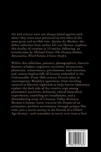 Art and science were not always pitted against each other: they were once perceived as two sides of the same great and terrible coin. Spiritus Ex Machina, the debut collection from author LC von Hessen, explores this duality of creation in 14 stories, following an introduction by Michael Cisco (The Divinity Student, Antisocieties, Weird Fiction: A Genre Study). Within this collection, painters, photographers, dancers, doctors, scholars, engineers, occultists, bureaucrats, plutocrats, restaurateurs, pro-dommes, mad scientists, and various hapless folk all become embroiled in the Unknowable. From 18th-century French salon to contemporary Brooklyn apartment, from traveling carnival to libertine nightclub to body-horror laboratory, explore the dark side of the creative urge among phantasmic machines, dubiously ethical biomedical experiments, unsettling art installations, and a discomforting array of Uncanny Valley denizens. Become a human worm, traverse the dreams of an automaton, perform necromancy through antique film reels, join a secret society in the bowels of a Gilded Age factory-and remember to never, ever trust a face.