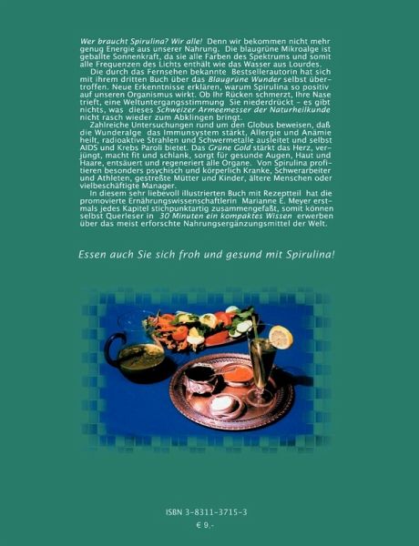 An Spirulina führt künftig kein Weg mehr vorbei. Denn die Lichtnahrung, die wie das Wasser aus Lourdes oder Fatima alle Farben des Spektrums und damit alle Frequenzen des Lichts enthält, schenkt uns Harmonie und Wohlbefinden. Das liebevoll illustrierte Buch mit Rezeptteil zeigt auf, warum wir diese jodfreie blaugrüne Wunderalge heute mehr benötigen denn je. Sie vermag es, radioaktive Strahlen, Schwermetalle und andere Gifte auszuleiten und unser Immunsystem zu stärken. Im Buch finden Sie sensationelle Studien und zahlreiche Erfahrungsberichte aus aller Welt, die Ihnen zeigen, wie Sie Schmerzen, Depressionen, Allergie, Anämie, ja selbst AIDS und Krebs Paroli bieten können. Das Buch enthält Marianne Meyers besten Rezepte: illustrierte Köstlichkeiten für den verwöhnten Gaumen und selbstgemachte Kosmetik für eine schöne Haut.
