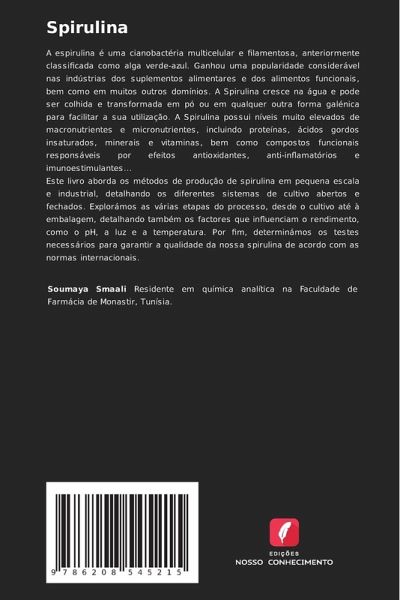 A espirulina é uma cianobactéria multicelular e filamentosa, anteriormente classificada como alga verde-azul. Ganhou uma popularidade considerável nas indústrias dos suplementos alimentares e dos alimentos funcionais, bem como em muitos outros domínios. A Spirulina cresce na água e pode ser colhida e transformada em pó ou em qualquer outra forma galénica para facilitar a sua utilização. A Spirulina possui níveis muito elevados de macronutrientes e micronutrientes, incluindo proteínas, ácidos gordos insaturados, minerais e vitaminas, bem como compostos funcionais responsáveis por efeitos antioxidantes, anti-inflamatórios e imunoestimulantes...Este livro aborda os métodos de produção de spirulina em pequena escala e industrial, detalhando os diferentes sistemas de cultivo abertos e fechados. Explorámos as várias etapas do processo, desde o cultivo até à embalagem, detalhando também os factores que influenciam o rendimento, como o pH, a luz e a temperatura. Por fim, determinámos os testes necessários para garantir a qualidade da nossa spirulina de acordo com as normas internacionais.