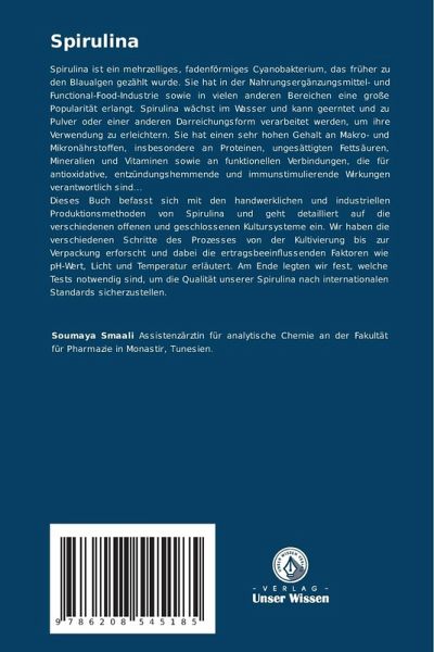 Spirulina ist ein mehrzelliges, fadenförmiges Cyanobakterium, das früher zu den Blaualgen gezählt wurde. Sie hat in der Nahrungsergänzungsmittel- und Functional-Food-Industrie sowie in vielen anderen Bereichen eine große Popularität erlangt. Spirulina wächst im Wasser und kann geerntet und zu Pulver oder einer anderen Darreichungsform verarbeitet werden, um ihre Verwendung zu erleichtern. Sie hat einen sehr hohen Gehalt an Makro- und Mikronährstoffen, insbesondere an Proteinen, ungesättigten Fettsäuren, Mineralien und Vitaminen sowie an funktionellen Verbindungen, die für antioxidative, entzündungshemmende und immunstimulierende Wirkungen verantwortlich sind...Dieses Buch befasst sich mit den handwerklichen und industriellen Produktionsmethoden von Spirulina und geht detailliert auf die verschiedenen offenen und geschlossenen Kultursysteme ein. Wir haben die verschiedenen Schritte des Prozesses von der Kultivierung bis zur Verpackung erforscht und dabei die ertragsbeeinflussendenFaktoren wie pH-Wert, Licht und Temperatur erläutert. Am Ende legten wir fest, welche Tests notwendig sind, um die Qualität unserer Spirulina nach internationalen Standards sicherzustellen.
