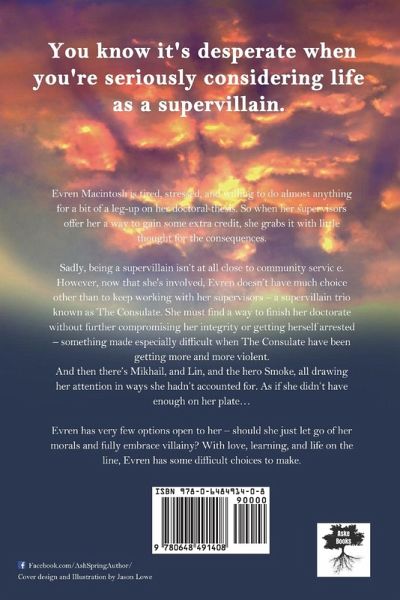 You know it's desperate when you're seriously considering life as a supervillain. Evren Macintosh is tired, stressed, and willing to do almost anything for a bit of a leg-up on her doctoral thesis. So when her supervisors offer her a way to gain some extra credit, she grabs it with little thought for the consequences. Sadly, being a supervillain isn't at all close to community service. However, now that she's involved, Evren doesn't have much choice other than to keep working with her supervisors - a supervillain trio known as The Consulate. She must find a way to finish her doctorate without further compromising her integrity or getting herself arrested - something made especially difficult when The Consulate have been getting more and more violent. And then there's Mikhail, and Lin, and the hero Smoke, all drawing her attention in ways she hadn't accounted for. As if she didn't have enough on her plate… Evren has very few options open to her - should she just let go of her morals and fully embrace villainy? With love, learning, and life on the line, Evren has some difficult choices to make.