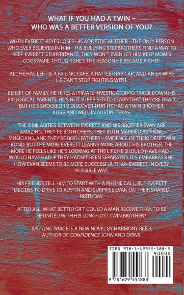 What if you had a twin - who was a better version of you? When Everett Reyes loses his adoptive mother - the only person who ever believed in him - his bullying stepbrothers find a way to keep Everett's inheritance. They won't even let him keep Mom's cookware, though she's the reason he became a chef. All he has left is a failing cafe, a rattletrap car, and an ex-wife he can't stop fighting with. Bereft of family, he hires a private investigator to track down his biological parents. He's not surprised to learn that they're dead, but he's shocked to discover that he has a twin brother, alive and well, in Austin, Texas. The similarities between Everett and his brother Evan are amazing. They're both chefs, they both married aspiring musicians, and they're both fathers - evidence of their deep twin bond. But the more Everett learns more about his brother, the more he feels like he's looking at the life he should have had - would have had if they hadn't been separated. It's embarrassing how Evan seems to be more successful than Everett in every possible way. His friends tell him to start with a phone call, but Everett decides to drive to Austin and surprise Evan on their shared birthday. After all, what better gift could a man receive than to be reunited with his long-lost twin brother? Spitting Image is a new novel by Harmony Reed, author of Confidence John and Drink.