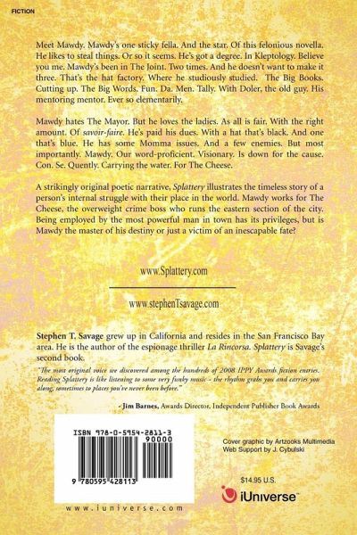Meet Mawdy. Mawdy's one sticky fella. And the star. Of this felonious novella. He likes to steal things. Or so it seems. He's got a degree. In Kleptology. Believe you me. Mawdy's been in The Joint. Two times. And he doesn't want to make it three. That's the hat factory. Where he studiously. Studied. The Big Books. Cutting up. The Big Words. Fun. Da. Men. Tally. With Doler, the old guy. His mentoring mentor. Ever so elementarily. Mawdy hates The Mayor. But he loves the ladies. As all is fair. With the right amount. Of savoir-faire. He's paid his dues. With a hat that's black. And one that's blue. He has some Momma issues. And a few enemies. But most importantly. Mawdy. Our word-proficient. Visionary. Is down for the cause. Con. Se. Quently. Carrying the water. For The Cheese. A strikingly original poetic narrative, Splattery illustrates the timeless story of a person's internal struggle with their place in the world. Mawdy works for The Cheese, the overweight crime boss who runs the eastern section of the city. Being employed by the most powerful man in town has its privileges, but is Mawdy the master of his destiny or just a victim of an inescapable fate?