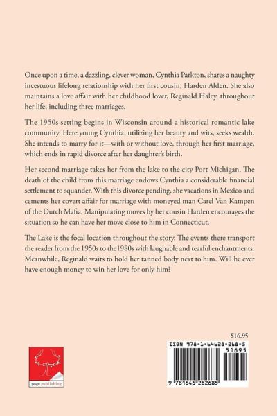 Once upon a time, a dazzling, clever woman, Cynthia Parkton, shares a naughty incestuous lifelong relationship with her first cousin, Harden Alden. She also maintains a love affair with her childhood lover, Reginald Haley, throughout her life, including three marriages. The 1950s setting begins in Wisconsin around a historical romantic lake community. Here young Cynthia, utilizing her beauty and wits, seeks wealth. She intends to marry for it-with or without love, through her first marriage, which ends in rapid divorce after her daughter's birth. Her second marriage takes her from the lake to the city Port Michigan. The death of the child from this marriage endows Cynthia a considerable financial settlement to squander. With this divorce pending, she vacations in Mexico and cements her covert affair for marriage with moneyed man Carel Van Kampen of the Dutch Mafia. Manipulating moves by her cousin Harden encourages the situation so he can have her move close to him in Connecticut. The Lake is the focal location throughout the story. The events there transport the reader from the 1950s to the1980s with laughable and tearful enchantments. Meanwhile, Reginald waits to hold her tanned body next to him. Will he ever have enough money to win her love for only him?
