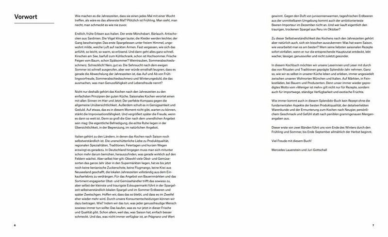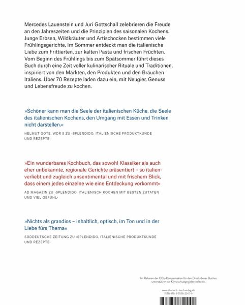 »[D]iese Leute wissen, wie man liebevoll und genau Produkte beschreibt. Und wie man Sehnsucht weckt.« Armin Thurnher, FALTER »Das Auge isst mit, und "Splendido - Primavera Estate" ist als Kochbuch schon ein besonderer Augenschmaus. Vor allem ist es dazu da, den Blick zu weiten und Neues und Überraschendes zu entdecken. Das gelingt hervorragend, macht beim Durchblättern wie beim Kochen großen Spaß und - das Wichtigste - es schmeckt.« Kais Harrabi, FRANKFURTER ALLGEMEINE ZEITUNG »Wie kaum jemand sonst stehen Mercedes Lauenstein und Juri Gottschall dafür, mit ihren Büchern den Purismus und die Qualität von Lebensmitteln und die Anmut der einfachen italienischen Küche zu feiern.« Benjamin Cordes, SPIEGEL.de »[A]m Küchentisch [geht] schon mal die Sonne auf.« Max Scharnigg, SZ ONLINE »Hell und frisch und mediterran« Wolfgang Fassbender, NZZ BELLEVUE »[M]an isst davon so viele Portionen wie möglich.« Lea Moser, KURIER »Frühlingsgefühle auf dem Teller« Felix Denk, TAGESSPIEGEL.DE »[Für] Freunde der unverfälschten, originalen italienischen Küche aus den besten Zutaten, die der Wochenmarkt erntefrisch zu bieten hat.« Peter Wagner, SPIEGEL.DE »Der Tag, an dem ein neues Splendido-Kochbuch erscheint, ist ein guter Tag.« Benjamin Cordes, KAISERGRANAT.COM »Frisch wie der Frühling, köstlich wie der Sommer: Wer nach neuen Ideen für eine leichte und trotzdem aromatische Küche für die warme Jahreshälfte sucht, wird hier fündig.« Ulrike Rösler, VALENTINAS-KOCHBUCH.DE »[D]ie Vorfreude aufs Genießen kann schon beim Planen und Einkaufen wachsen.« Sophia Feldmer, FREUNDIN »[E]ine Zubereitung, die so einfach wie möglich ist und auf Intuition statt auf grammgenaue Angaben setzt. Auch die Gestaltung ist reduziert: klare Formen und ruhige Bildsprache. Was bleibt, ist die Lust aufs Nachkochen.« Julius Schneider, DER FEINSCHMECKER »Mit ein bisschen Intuition kann man hier nichts falsch machen.« Marie-Luise Wenzlawski, DONNA »['Splendido'] entspricht, wie seine beiden Vorgänger auch, exakt der Vorstellung italienischer Küche, wie ich sie habe: im Prinzip einfach, regional unterschiedlich, mit wenigen, aber stets sehr guten und frischen Zutaten zubereitet, auch an den Jahreszeiten orientiert.« Axel Hacke, BRIEF AUS DEM BÜRO »[F]rühlingshafte und sommerliche Rezepte« Eva Biringer, ZEIT MAGAZIN online »Auch das dritte Buch von Mercedes Lauenstein und Juri Gottschall ist wieder ein Volltreffer!« Nora von Westphalen, ELLE.DE »[M]it stimmungsvollen Rezepten und zahlreichen Tipps« Bernadette Bayrhammer, DIE PRESSE AM SONNTAG »Die Splendido-Kochbuchreihe tischt die schönste Jahreszeit auf: italienische Küche für Frühling und Sommer, man hat den Geschmack fast auf der Zunge.« Nils Klein, GLOW