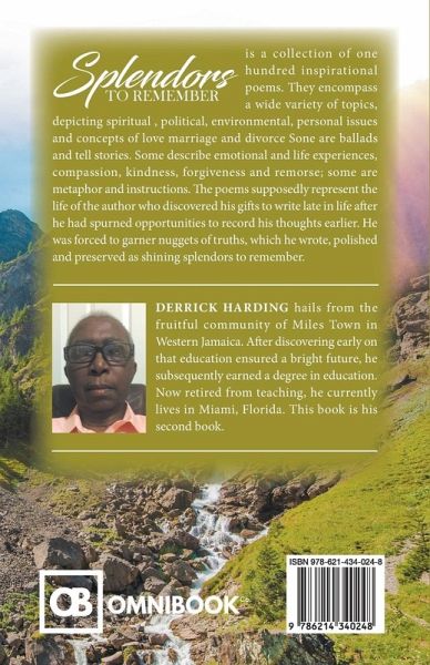 Splendors to remember is a collection of one hundred inspirational poems. They encompass a wide variety of topics, depicting spiritual , political, environmental, personal issues and concepts of love marriage and divorce Sone are ballads and tell stories. Some describe emotional and life experiences, compassion, kindness, forgiveness and remorse; some are metaphor and instructions. The poems supposedly represent the life of the author who discovered his gifts to write late in life after he had spurned opportunities to record his thoughts earlier. He was forced to garner nuggets of truths, which he wrote, polished and preserved as shining splendors to remember.