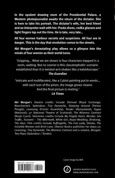 In the opulent drawing room of the Presidential Palace, a Western photojournalist awaits the return of the dictator. She is here to take his portrait. The dictator's wife, her best friend and an interpreter wait with her. Prada shoes, vodka glasses and light fingers tap out the time. He is late, very late. All four women harbour secrets and suspicions. All four are in danger. This is the day that revolution comes to the streets. Abi Morgan's devastating play allows us a glimpse into the minds of four women as their world turns.