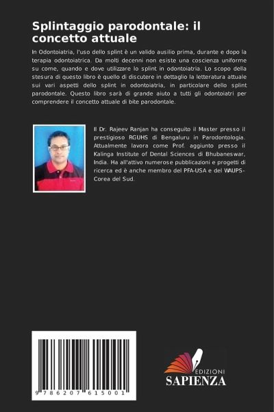In Odontoiatria, l'uso dello splint è un valido ausilio prima, durante e dopo la terapia odontoiatrica. Da molti decenni non esiste una coscienza uniforme su come, quando e dove utilizzare lo splint in odontoiatria. Lo scopo della stesura di questo libro è quello di discutere in dettaglio la letteratura attuale sui vari aspetti dello splint in odontoiatria, in particolare dello splint parodontale. Questo libro sarà di grande aiuto a tutti gli odontoiatri per comprendere il concetto attuale di bite parodontale.