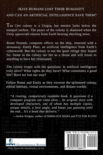 Have Humans lost their Humanity and Can an Artificial Intelligence Save Them? The Tau Ceti colony is a Utopia, but tension lurks below the tranquil surface. The peace of the colony is shattered when the Unity spacecraft returns from Earth bearing shocking news. Rome Permek, computer officer on the ship, returned with a stowaway: Emily Plair, an artificial intelligence from Earth's cyberworld. But the colony is not the quiet refuge they hoped for. Some in the colony see her as a threat and will resort to anything to have her eliminated. The colony erupts with the questions: Is artificial intelligence truly alive? What rights do they have? What constitutes a good life? Follow Rome and Emily as they traverse the broken paradise colony, orbital habitats, virtual environments, and distant worlds. This book is a sequel to the author's novel Outside. "A riveting, compulsively readable book. It questions if a computer program can come alive... An original story with developed characters, one of whom has multiple copies, offers unique details, a love angle and keeps you guessing until the end... It's a book that delivers." --Jackie Kingon, author of Sherlock Mars and P Is For Pluto.