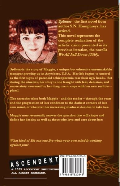 Splinter is the story of Maggie, a unique but otherwise unremarkable teenager growing up in Anywhere, USA. Her life begins to unravel as the first signs of paranoid schizophrenia rear their ugly heads. Set in the nineties, her story is one fraught with fear, delusion, and uncertainty worsened by her drug use to cope with her new realities-plural. The narrative takes both Maggie - and the reader - through the years and the progression of her condition to the darkest corners of her own mind, or wherever her increasing madness decides to take her. Maggie must eventually answer the question that will shape and define her destiny as well as that of those who love and care about her: What kind of life can one live when their own mind is working against them?