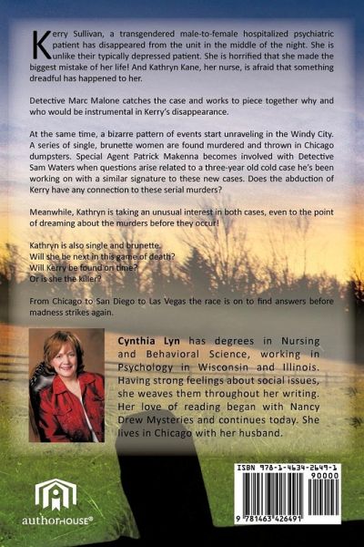 Kerry Sullivan, a transgendered male-to-female hospitalized psychiatric patient has disappeared from the unit in the middle of the night. She is unlike the nurse's typical depressed patient. She is horrified that she made the biggest mistake of her life! And Kathryn Kane, her nurse, is afraid that something dreadful has happened to her. Detective Marc Malone catches the case and works to piece together why and who would be instrumental in Kerry's disappearance. At the same time, a bizarre pattern of events start unraveling in the Windy City. A series of single, brunette women are found murdered and thrown in Chicago dumpsters. Special Agent Patrick Makenna becomes involved with Detective Sam Waters when questions arise related to a three-year old cold case he's been working on with a similar signature to these new cases. Does the abduction of Kerry have any connection to these serial murders? Meanwhile, Kathryn is taking an unusual interest in both cases, even to the point of dreaming about the murders before they occur! Kathryn is also single and brunette. Will she be next in this game of death? Will Kerry be found on time? Or is she the killer? From Chicago to San Diego to Las Vegas the race is on to find answers before madness strikes again.