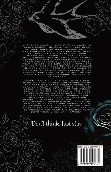Theodore Giovanni was finally going to leave behind the grim town that held so many dark memories. Rising among the ranks on the ice, he had done well as Thunderbirds's star Left Wing within the Division 1 Hockey league. Well enough that he had signed an NHL contract which guaranteed his freedom from the gruesomely checkered past that had been his life. Just a few more months and he would be able to escape the gory truth hidden beneath years of lies. Everything was going perfectly as planned for Theo, until he met the one person that could change his fate in an instant: Enter Danica Ellis, a girl with a few dark secrets of her own. Having spent the past two years solely trying to survive whilst living under the intense scrutiny of her family and the public eye, she has had to cross a few lines of her own. As his teammate's younger sister, Danica is more trouble than Theo ever bargained for. Just one wrong look in her direction could send his carefully guarded heart spiraling. Bending more rules and pushing a few boundaries might just be the only way to save her from Hell, but will trying to protect her from the flames send both their lives up in smoke?
