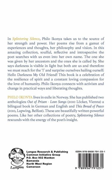 In Splintering Silence, Philo Ikonya takes us to the source of her strength and power. Her poems rise from a gamut of experiences and thoughts, her philosophy and vision. In this amazing collection, soulful, reflective and introspective the poet searches with us even into her own name. The one she was given by her ancestors and the ones she is called by. She says darkness is visible in light but both are us and therefore we must reach for the 'I' and surprise ourselves hailing ourself: Hello Darkness My Old Friend! This book is a celebration of the resilience of spirit and a constant loving compassion for the love of humanity. Philo Ikonya connects with activism and change in practical ways and liberating thoughts.