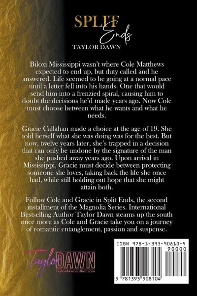 Biloxi Mississippi wasn't where Cole Matthews expected to end up, but duty called and he answered. Life seemed to be going at a normal pace until a letter fell into his hands. One that would send him into a frenzied spiral, causing him to doubt the decisions he'd made years ago. Now Cole must choose between what he wants and what he needs. Gracie Callahan made a choice at the age of 19. She told herself what she was doing was for the best. But now, twelve years later, she's trapped in a decision that can only be undone by the signature of the man she pushed away years ago. Upon arrival in Mississippi, Gracie must decide between protecting someone she loves, taking back the life she once had, while still holding out hope that she might attain both. Follow Cole and Gracie in Split Ends, the second installment of the Magnolia Series. International Bestselling Author Taylor Dawn steams up the south once more as Cole and Gracie take you on a journey of romantic entanglement, passion and suspense.