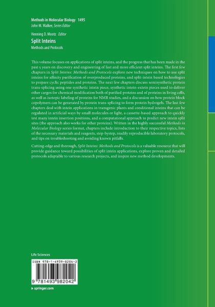 Cutting-edge and thorough, Split Inteins: Methods and Protocols is a valuable resource that will provide guidance toward possibilities of split intein applications, explore proven and detailed protocols adaptable to various research projects, and inspire new method developments.