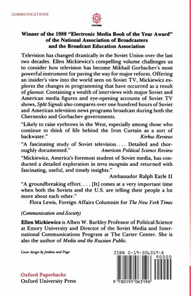Television has changed drastically in the Soviet Union over the last three decades. In 1960, only five percent of the population had access to TV, but now the viewing population has reached near total saturation. Today's main source of information in the USSR, television has become Mikhail Gorbachev's most powerful instrument for paving the way for major reform. Containing a wealth of interviews with major Soviet and American media figures and fascinating descriptions of Soviet TV shows, Ellen Mickiewicz's wide-ranging, vividly written volume compares over one hundred hours of Soviet and American television, covering programs broadcast during both the Chernenko and Gorbachev governments. Mickiewicz describes the enormous significance and popularity of news programs and discusses how Soviet journalists work in the United States. Offering a fascinating depiction of the world seen on Soviet TV, she also explores the changes in programming that have occurred as a result of glasnost.