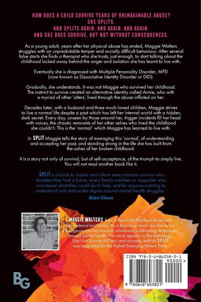 How does a child survive years of unimaginable abuse?She splits.And splits again. And again. And again.And she does survive. But not without consequences. As a young adult, years after her physical abuse has ended, Maggie Walters (continually struggles with an unpredictable temper and socially difficult behaviour) has to leave yet another job due to her unpredictable temper and socially difficult behavior. After several false starts she finds a therapist who she trusts, just enough, to start talking about the childhood locked away behind the anger and isolation she has learnt to live with. Eventually she is diagnosed with Multiple Personality Disorder, MPD (now known as Dissociative Identity Disorder or DID). Gradually, she understands. It was not Maggie who survived her childhood. The instinct to survive created an alternative identity called Annie, who with a myriad of other 'alters', lived through the abuse inflicted on her. Decades later, with a husband and three much-loved children, Maggie strives to live a normal life despite a past which has left her internal world with a hidden, dark secret. Every day, unseen by those around her, trigger incidents fill her head with voices, the chaotic remnants of her other selves who lived the childhood she couldn't. This is the 'normal' which Maggie has learned to live with. In SPLIT Maggie tells the story of managing this 'normal', of understanding and accepting her past, and standing proud in the life she has built from the ashes of her broken childhood. It is a story not only of survival, but of self-acceptance, of the triumph to simply live. You will not read another book like it.