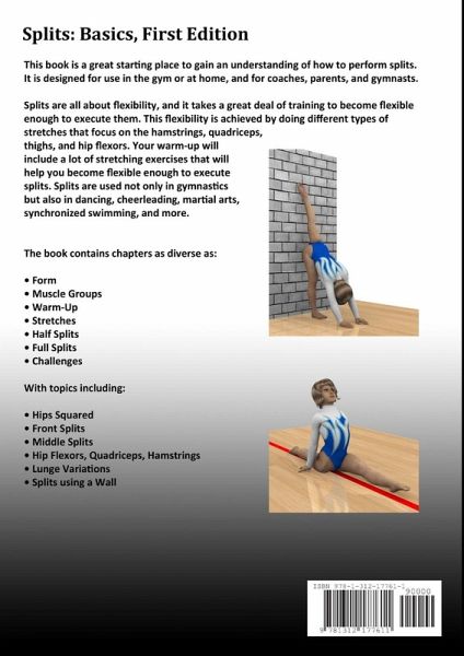 This book is a great starting place to gain an understanding of how to perform splits. It is designed for use in the gym or at home, and for coaches, parents, and gymnasts. Splits are all about flexibility, and it takes a great deal of training to become flexible enough to execute them. This flexibility is achieved by doing different types of stretches that focus on the hamstrings, quadriceps, thighs, and hip flexors. Your warm-up will include a lot of stretching exercises that will help you become flexible enough to execute splits. Splits are used not only in gymnastics but also in dancing, cheerleading, martial arts, synchronized swimming, and more.
