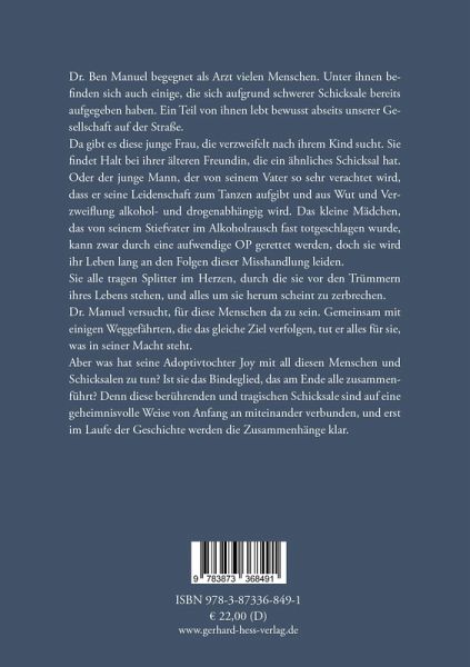 Dr. Ben Manuel begegnet als Arzt vielen Menschen. Unter ihnen befinden sich auch einige, die sich aufgrund schwerer Schicksale bereits aufgegeben haben. Ein Teil von ihnen lebt bewusst abseits unserer Gesellschaft auf der Straße. Da gibt es diese junge Frau, die verzweifelt nach ihrem Kind sucht. Sie findet Halt bei ihrer älteren Freundin, die ein ähnliches Schicksal hat. Oder der junge Mann, der von seinem Vater so sehr verachtet wird, dass er seine Leidenschaft zum Tanzen aufgibt und aus Wut und Verzweiflung alkohol- und drogenabhängig wird. Das kleine Mädchen, das von seinem Stiefvater im Alkoholrausch fast totgeschlagen wurde, kann zwar durch eine aufwendige OP gerettet werden, doch sie wird ihr Leben lang an den Folgen dieser Misshandlung leiden. Sie alle tragen Splitter im Herzen, durch die sie vor den Trümmern ihres Lebens stehen, und alles um sie herum scheint zu zerbrechen. Dr. Manuel versucht, für diese Menschen da zu sein. Gemeinsam mit einigen Weggefährten, die das gleiche Ziel verfolgen, tut er alles für sie, was in seiner Macht steht. Aber was hat seine Adoptivtochter Joy mit all diesen Menschen und Schicksalen zu tun? Ist sie das Bindeglied, das am Ende alle zusammenführt? Denn diese berührenden und tragischen Schicksale sind auf eine geheimnisvolle Weise von Anfang an miteinander verbunden, und erst im Laufe der Geschichte werden die Zusammenhänge klar.