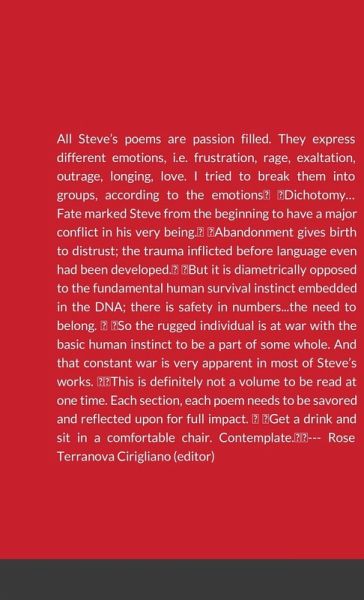 Drawing on his personal experience & lifelong introspection, Steve Stone takes us on a journey exploring every recess of the human mind and soul. With an outstanding brilliance, he conveys in words concepts & feelings inexpressible to most. Crying pearls of blood & sweating tears of compassion for any fellow human in pain, with the wisdom of ancestors, the vision of prophets and an all but fleeting lucidity, he points us to disturbing truths about our times in which the individual is too often isolated, crushed by a society more concerned about profit than by giving to each, at least a little of what Mother Nature provides for all. (Jane Voiret aka "Sweet Jane")