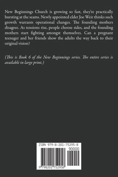 New Beginnings Church is growing so fast, they're practically bursting at the seams. Newly appointed elder Joe Weir thinks such growth warrants operational changes. The founding mothers disagree. As tensions rise, people choose sides, and the founding mothers start fighting amongst themselves. Can a pregnant teenager and her friends lead the adults back to their original vision? (This is Book 6 of the New Beginnings Christian Fiction Series. The entire series is available in large print.)
