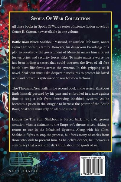 All three books in 'Spoils Of War', a series of science fiction novels by Conor H. Carton, now available in one volume! Bottle Born Blues: Shakbout Mansard, an artificial life form, wants a quiet life with his family. However, his dangerous knowledge of a plot to overthrow the government of Mengchi makes him a target for terrorists and security forces alike. To make matters worse, he has been hiding a secret that could threaten the lives of all free bottle-born life forms across the systems. In this gripping sci-fi novel, Shakbout must take desperate measures to protect his loved ones and prevent a systems-wide war between factions. The Thousand Year Fall: In the second book in the series, Shakbout finds himself pursued by his past and embroiled in a race against time to stop a cult from destroying inhabited systems. As he becomes a pawn in the struggle to harness the power of the Bottle Born, Shakbout must rely on allies to survive. Ladder To The Sun: Shakbout is forced back into a dangerous situation when a claimant to the Emperor's throne arises, risking a return to war in the Inhabited Systems. Along with his allies, Shakbout fights to stop the process, but faces many obstacles from those who wish to prevent him. As he delves deeper, he uncovers a conspiracy that reveals the dark truth about the spoils of war.