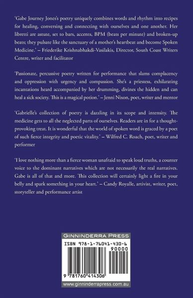 'Gabe Journey Jones's poetry uniquely combines words and rhythm into recipes for healing, conversing and connecting with ourselves and one another. Her libretti are astute, set to bars, accents, BPM (beats per minute) and broken-up beats; they pulsate like the sanctuary of a mother's heartbeat and become Spoken Medicine.' - Friederike Krishnabhakdi-Vasilakis, Director, South Coast Writers Centre, writer and facilitator 'Passionate, percussive poetry written for performance that slams complacency and oppression with urgency and compassion. She's a priestess, exhilarating incantations heard accompanied by her drumming, divines the hidden and can heal a sick society. This is a magical potion.' - Jenni Nixon, poet, writer and mentor 'Gabrielle's collection of poetry is dazzling in its scope and intensity. The medicine gets to all the neglected parts of ourselves. Readers are in for a thought-provoking treat. It is wonderful that the world of spoken word is graced by a poet of such fierce integrity and poetic vitality.' - Wilfred C. Roach, poet, writer and performer 'I love nothing more than a fierce woman unafraid to speak loud truths, a counter voice to the dominant narratives which are not necessarily the real narratives. Gabe is all of that and more. This collection will certainly light a fire in your belly and spark something in your heart.' - Candy Royalle, artivist, writer, poet, storyteller and performance artist