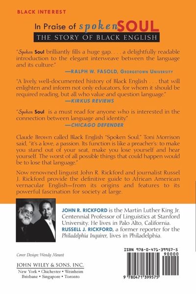 In Praise of Spoken Soul: The Story of Black English "Spoken Soul brilliantly fills a huge gap. . . . a delightfully readable introduction to the elegant interweave between the language and its culture." ?Ralph W. Fasold, Georgetown university "A lively, well-documented history of Black English . . . that will enlighten and inform not only educators, for whom it should be required reading, but all who value and question language." ?Kirkus Reviews "Spoken Soul is a must read for anyone who is interested in the connection between language and identity." ?Chicago Defender Claude Brown called Black English "Spoken Soul." Toni Morrison said, "It's a love, a passion. Its function is like a preacher's: to make you stand out of your seat, make you lose yourself and hear yourself. The worst of all possible things that could happen would be to lose that language." Now renowned linguist John R. Rickford and journalist Russell J. Rickford provide the definitive guide to African American vernacular English?from its origins and features to its powerful fascination for society at large.