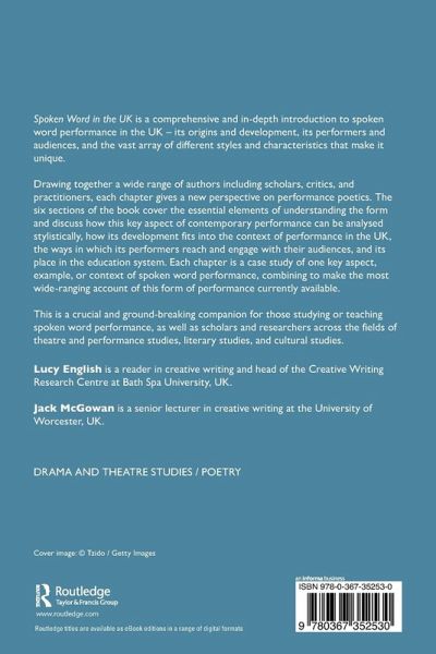 Foreword by Luke Kennard; Introduction: Setting the Stage: An Introduction to Spoken Word in the UK - Jack McGowan and Lucy English (Editors); Section 1: Background to Spoken Word in the UK; Chapter 1: Biting Back Against the Fascist Octopus: The Story of Apples and Snakes - Russell Thompson; Chapter 2: Suffering Fools: The survival and adaptation of British absurd, comic, and satirical traditions in the era of poetry slams - Steve Larkin; Chapter 3: Black Country, Ay We - Voices from Post-Industrial Britain - Emma Purshouse and R. M. Francis; Chapter 4: The New October Poets - Adrian Johnson; Chapter 5: Glasgow, Scotland and Spoken Word from 1986 to 2018 - Jim Ferguson; Chapter 6: A critical account of the development of Spoken Word events and settings in Wales in collaboration with partners in Sweden and Ireland - Mel Perry and Dominic Williams; Chapter 7: The Democracy of Poetry: The Bristol Spoken Word Scene - Lucy English; Section 2: Audience and Performer; Chapter 8: The Spoken Word Experience: affect transmission in contemporary performance poetry - Jack McGowan; Chapter 9: The Limitations of the Page/Stage Dichotomy: Examining the page/stage divide - Niall O'Sullivan; Chapter 10: Exploring the relationship between audience and performer, the implications of the affective turn in reader-response and the emancipation of the passive spectator - Scott Martingell; Chapter 11: 'Speak Your Truth': Authenticity in UK Spoken Word Poetry - Katie Ailes; Chapter 12: Audience as Co-Author: Poet-Audience Relationship in Performance Poetry - Lauren McNamara; Chapter 13: Listen to me! The moral value of the poetry performance space - Karen Simecek; Chapter 14: Audience and performer responses to performing 1-2-1 and intimate poetry - Debra Watson; Section 3: Cultural Exchange; Chapter 15: Poetic Orality in Working-Class Culture 1840-70 - Simon Rennie; Chapter 16: She Grrrowls: Feminism in Contemporary Spoken Word - Carmina Masoliver; Chapter 17: Playing for Affect in Counterpublics: An Interdisciplinary Investigation into the Transformative Potential of Spoken Word Hybridity - Katy Wareham Morris; Chapter 18: The Metic Experience of the Black British Writer: Challenging the Margins - Nick Makoha; Chapter 19: Overthrowing Societal Norms Through the Spoken Word: Benjamin Zephaniah's Dub Poetry in City Psalms - Ian Hickey; Chapter 20: The Impact of Malika's Poetry Kitchen on the UK Poetry Scene - Sundra Lawrence; Section 4: Styles and Techniques; Chapter 21: Fish Out of Water or Creative Chameleon?: Spoken Word as a form of Social Mobility - Kate Fox; Chapter 22: Style and Technique in Spoken Word - David Hubble; Chapter 23: British Spoken Word Voice - Hannah Silva; Chapter 24: I thought I was just coming to watch: Audience Participation in Spoken Word Performance - Rose Condo; Section 5: Pedagogy of Spoken Word; Chapter 25: How can developing an Overarching Pedagogical Metaphor defining my own poetics, aid my teaching of creative writing and 'Spoken Word Education'? - Amy Neilson; Chapter 26: Spoken Word Education: The Role of a Spoken Word Educator: Pitfalls and Possibilities - Sara Hirsch; Chapter 27: Searching for Consistency: Applying Reflective Equilibrium to Performance Poetry Criticism - Ross McFarlane and Bibi June Schwithal; Chapter 28: Spoken Word as Therapy and Power - Jhilmil Breckenridge; Chapter 29: Intersections Between Spoken Word in the UK and US: A Nexus in Dialogue - Helen Johnson and Jacob Sam La Rose; Section 6: Publicity and Distribution; Chapter 30: Speaking with Machines & Machines that Speak: Spoken Word & Digital Performance Poetry - David Devanny; Chapter 31: The Capital of Culture and the Culture of Capital: The Controversy of Commerce in Spoken Word - Peter Bearder; Chapter 32: Poetry Slam in the UK - Toby Campion; Chapter 33: More Show, Less Tell?: How do we talk about spoken word now that it is working on a theatre stage? - Sharon Clark and Ruth Stacey; Chapter 34: Spoken Word in Print. Instant Coffee: A conversation with Clive Birnie from Burning Eye Books -Clive Birnie (interviewed by Lucy English)