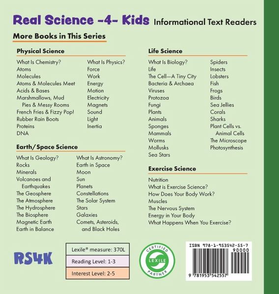 Young readers discover that sponges are soft-bodied animals that live in oceans and fresh water. Sponges can be very small or very big and come in different colors and shapes. Some sponges are used by fish as hiding places. Although some sponges look like plants, sponges are not plants but animals because they are made of animal cells. Cells, atoms, and molecules are defined. Fundamental science concepts in biology are explained through simply written text and colorful illustrations and photographs. A pronunciation guide of scientific terms is included. 24 pages. Reading Level 1-3, Interest Level 2-5.