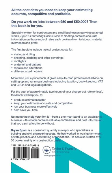 Specifically written for contractors and small businesses carrying out small works, Spon's Estimating Cost Guide to Roofing contains accurate information on thousands of rates, each broken down to labour, material overheads and profit. This is the first book to include typical project costs for slating and tiling, sheeting, cladding and other coverings, rooflights, underfelt and battens, repairs and alterations, and different sized houses.