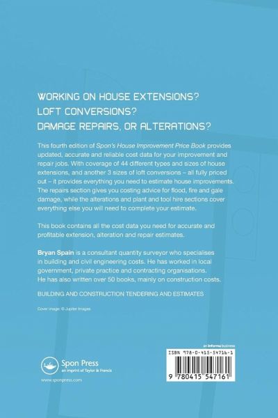 House improvement continues with a range of extensions loft conversions insulation damage repairs kitchens and alterations. Competition for this work is stiff and accurate estimates and costings make a good deal of difference. Compiled especially for small and medium contractors and for all those involved in building traditional extensions or converting lofts Spon's House Improvement Price Book provides detailed and reliable cost data. Fully-priced out standard items cover 44 house extensions of different types and sizes plus three loft conversions. In addition there are chapters on the pricing of common alterations repair of damage due to floods fire and gales and on plant and tool hire.