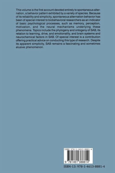 A wide variety of species, including human beings, exhibits a remarkably reliable behavior pattern, known as spontaneous alternation behavior (SAB), that has intrigued researchers for over seven decades. Though the details may vary depending on species and setting, SAB essentially entails first choosing one member of a pair of alternatives and then the other, without instructions or incen tives to do so. Spontaneous alternation is manifested even in the early trials of a discrimination-learning experiment, where only one of the choices is reinforced. Indeed, that was the setting in which SAB was first noted (Hunter, 1914). Rein forcement contingencies, evidently, are superimposed, not on a random sequence of choices, but on a potent, systematic behavior pattern. This book is the first to be devoted entirely to SAB and closely related phenomena, such as habituation and exploration. The literature on SAB is vast, covering a host of questions ranging from the cues that guide alternation to its phylogenetic and ontogenetic generality, its relation to learning and motivation, and its neurochemical substrates. In separate chapters we take up each of the major issues, reviewing what is known about the several facets of SAB and revealing areas of ignorance. The chapter authors were encouraged to discuss their own research where pertinent, some of it as yet unpublished, indeed some conducted specifically for this volume.