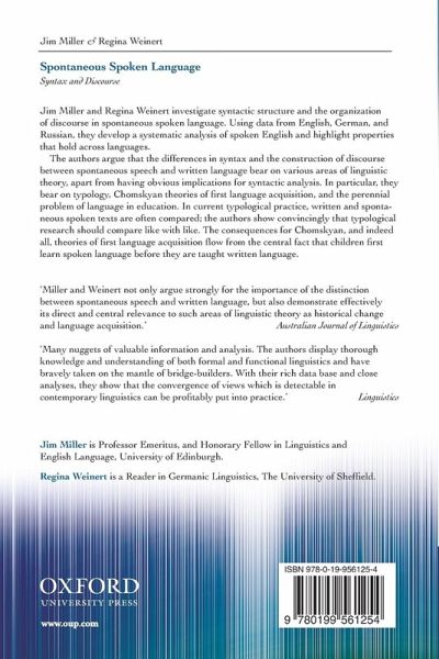 Jim Miller and Regina Weinert investigate syntactic structure and the organization of discourse in spontaneous spoken language. Using data from English, German, and Russian, they develop a systematic analysis of spoken English and highlight properties that hold across languages.