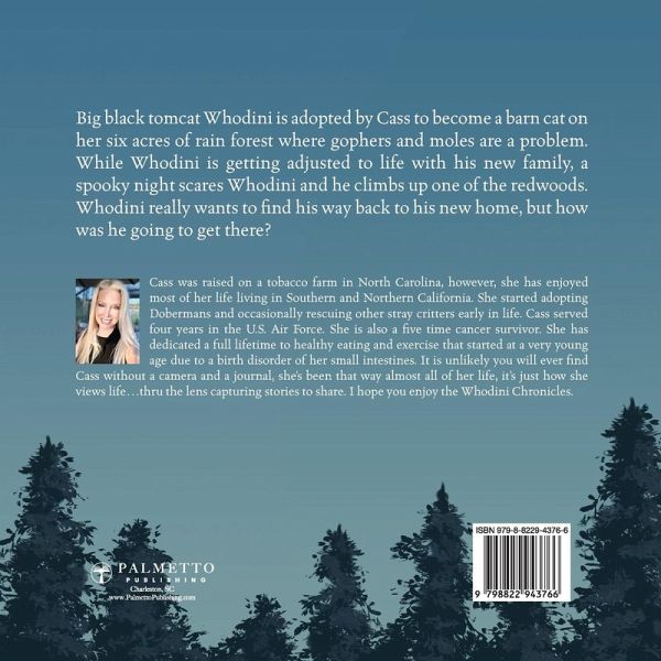 Travel with black cat Whodini as he navigates a scary night and tries to find his way back home. Cass lives on six acres in a rain forest with giant redwood trees in Northern California, and she's realized that gophers and moles are a problem. She goes to the animal shelter to adopt a barn cat and finds big black tomcat Whodini. The shelter-workers warn Cass that Whodini doesn't like many people, but Whodini warms up to Cass, and it's love at first sight for Cass. Cass takes Whodini home and starts to slowly introduce him to his new family, including Cass's big Dobermans. While Whodini is getting adjusted to his new home and new friends, a scary night happens. Frightened, Whodini climbs up one of the tall redwood trees and runs away. When the fear wears off, Whodini realizes that he's lost. He really wants to go back to his safe home, but how will he find it again? Spooky Night with Whodini is an amazing adventure for children aged 3 to 8. Parents and caregivers can use the story to help teach kids to overcome fears, learn survival skills, and make new friends. Spooky Night with Whodini makes a heartwarming bedtime story or a fantastic car travel tale.