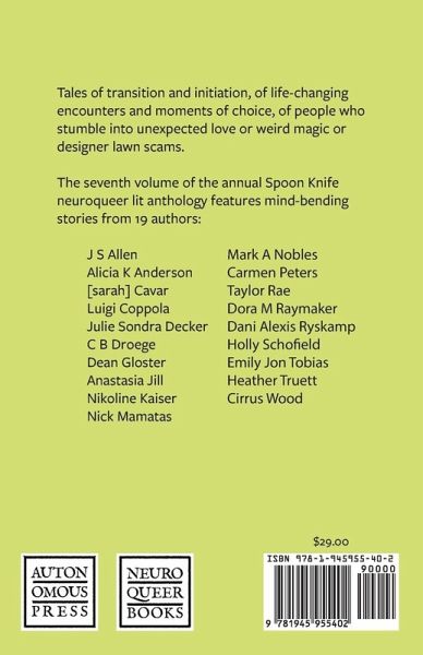 Tales of transition and initiation, of life-changing encounters and moments of choice, of people who stumble into unexpected love or weird magic or designer lawn scams. The seventh volume of the annual Spoon Knife neuroqueer lit anthology features mind-bending stories from 19 authors: J S Allen Alicia K Anderson [sarah] Cavar Luigi Coppola Julie Sondra Decker C B Droege Dean Gloster Anastasia Jill Nikoline Kaiser Nick Mamatas Mark A Nobles Carmen Peters Taylor Rae Dora M Raymaker Dani Alexis Ryskamp Holly Schofield Emily Jon Tobias Heather Truett Cirrus Wood