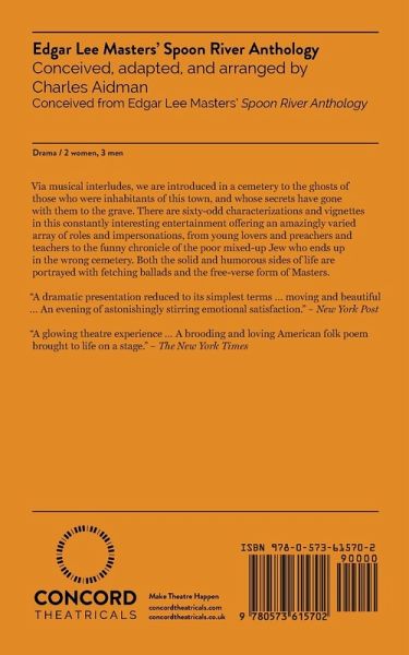 Charles Aidman, conceived from Edgar Lee Masters' Spoon River Anthology Dramatic Platform Readings w/incidental music, songs Characters: 3 male, 2 female Bare Stage. Via musical interludes, we are introduced in a cemetery to the ghosts of those who were inhabitants of this town, and whose secrets have gone with them to the grave. There are 60 odd characterizations and vignettes in this constantly interesting entertainment offering an amazingly varied array of