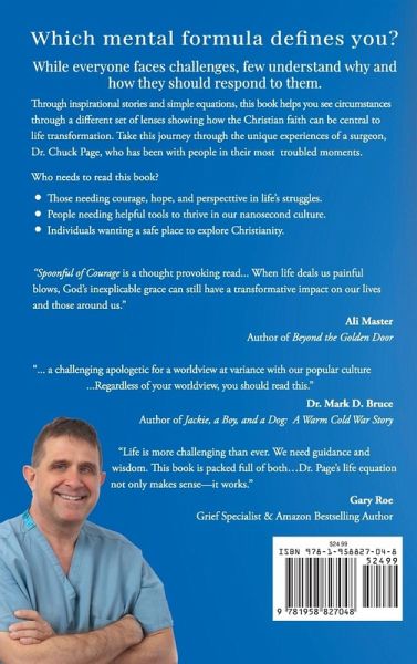 HOW TO TRANSFORM YOUR THINKING USING A SIMPLE EQUATION While everyone faces challenges, few understand why and how they should respond to them. Through inspirational stories and simple equations, this book shows you how to see your problems using a different set of lenses. What makes Spoonful of Courage unique among other Christian self-improvement books is the way it's presented-through formulas. Most people adopt a mental framework which confines them. They see themselves as victims or zeroes. And most books on self-improvement move you from victim to hero using self-help techniques. This self-improvement book uses equations to transform how you see your circumstances, encouraging you to embrace grace thinking. Instead of confining you, these formulas help define and refine your thinking. In this grace book, God is the hero. And through these inspirational stories, you'll discover:You don't have to be a victim to life's circumstances. You don't have to adopt a zero mentality, thinking of yourself as inadequate. You don't have to be the hero of your story, carrying the stress and burdens of life. This work discusses why so many people believe in a higher power and more specifically-the Christian faith. This courage book is more than a Christian apologetics book. It discusses psychology and self-help-from a Christian worldview. Each spoonful explores how we see circumstances, how we see life, and how we see the big picture, helping your walk with God in a fresh and personal way. This book is for you if:Your need a dose of hope, courage, and perspective in your life challenges. You're looking for helpful tools to thrive in our nanosecond culture. You want a safe place to explore Christianity and spirituality. In this book you will:Explore how you see our circumstances Gain helpful resources for Christian personal growth Understand how to deal with emotions Obtain techniques on stress management Learn about grace and the impact it makes on how you see life. Discover evidence for why Christians believe what they believe.