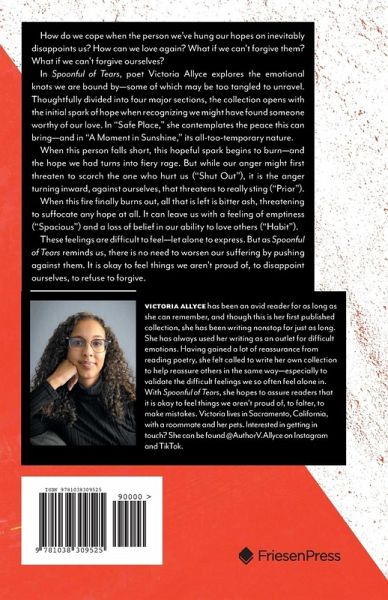 How do we cope when the person we've hung our hopes on inevitably disappoints us? How can we love again? What if we can't forgive them? What if we can't forgive ourselves? In Spoonful of Tears, poet Victoria Allyce explores the emotional knots we are bound by-some of which may be too tangled to unravel. Thoughtfully divided into four major sections, the collection opens with the initial spark of hope when recognizing we might have found someone worthy of our love. In "Safe Place," she contemplates the peace this can bring-and in "A Moment in Sunshine," its all-too-temporary nature. When this person falls short, this hopeful spark begins to burn-and the hope we had turns into fiery rage. But while our anger might first threaten to scorch the one who hurt us ("Shut Out"), it is the anger turning inward, against ourselves, that threatens to really sting ("Prior"). When this fire finally burns out, all that is left is bitter ash, threatening to suffocate any hope at all. It can leave us with a feeling of emptiness ("Spacious") and a loss of belief in our ability to love others ("Habit"). These feelings are difficult to feel-let alone to express. But as Spoonful of Tears reminds us, there is no need to worsen our suffering by pushing against them. It is okay to feel things we aren't proud of, to disappoint ourselves, to refuse to forgive.