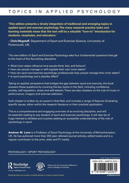 The new edition of Sport and Exercise Psychology asks four fundamental questions that get to the heart of this flourishing discipline: What inner states influence what people think, feel, and behave? How can people manage or self-regulate their own inner states? How can sport and exercise psychology professionals help people manage their inner states? Is sport psychology just a placebo effect? Taking an applied perspective that bridges the gap between sport and exercise, the book answers these questions by covering the key topics in the field, including confidence, anxiety, self-regulation, stress and self-esteem. There are also chapters on the role of music in performance, imagery and exercise addiction. Each chapter is written by an expert in that field, and includes a range of features illustrating specific issues, either within the research literature or their practical application. This is a comprehensive and engaging overview of an evolving discipline, and will be essential reading to any student of sport and exercise psychology. It will also be of huge interest to athletes and coaches seeking an accessible understanding of the role of psychology in sport.