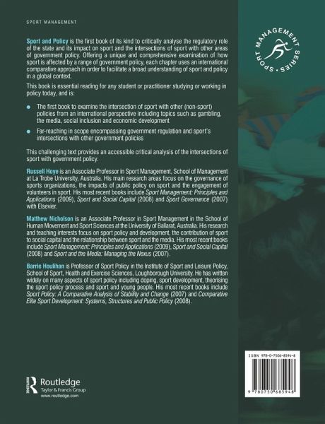 Sport and Policy is the first book of its kind to critically analyse the regulatory role of the state and its impact on sport and the intersections of sport with other areas of government policy. Offering a unique and comprehensive examination of how sport is affected by a range of government policy, each chapter uses an international comparative approach in order to facilitate a broad understanding of sport and policy in a global context.