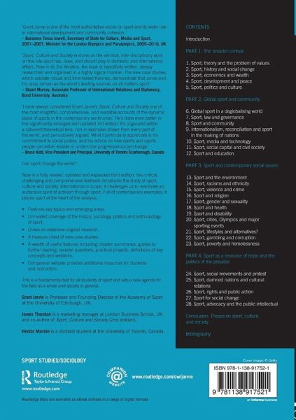 "I have always considered Grant Jarvie's Sport, Culture and Society one of the most insightful, comprehensive, and readable accounts of the dynamic place of sports in the contemporary world order. He's done even better in this significantly enlarged and updated 3rd edition. It's organized within a coherent theoretical lens, rich in examples drawn from every part of the world, and persuasively argued. What I particularly appreciate is his commitment to social justice, and his advice on how sports and sportspeople can either enable or undermine progressive social change." - Bruce Kidd, Vice President and Principal, University of Toronto Scarborough, Canada
