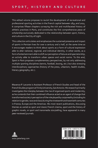 This edited volume proposes to revisit the development of recreational and professional sporting activities in the French capital between 1854 and 2024. It comprises fifteen chapters surveying the rich and multifaceted history of athletic practices in Paris, and constitutes the first comprehensive piece of scholarship exclusively dedicated to the relationship between sport, history, and culture in the City of Light.
