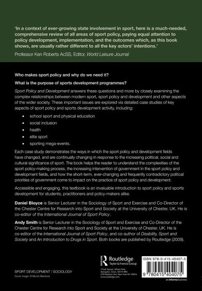 Who makes sport policy and why do we need it? What is the purpose of sport development programmes? Sport Policy and Development answers these questions and more by closely examining the complex relationships between modern sport, sport policy and development and other aspects of the wider society. These important issues are explored via detailed case studies of key aspects of sport policy and sport development activity, including: school sport and physical education social inclusion health elite sport sporting mega-events. Each case study demonstrates the ways in which the sport policy and development fields have changed, and are continually changing in response to the increasing political, social and cultural significance of sport. The book helps the reader to understand the complexities of the sport policy-making process, the increasing intervention of government in the sport policy and development fields, and how the short-term, ever-changing and frequently contradictory political priorities of government come to impact on the practice of sport policy and development. Accessible and engaging, this textbook is an invaluable introduction to sport policy and sport development for students, practitioners and policy-makers alike.