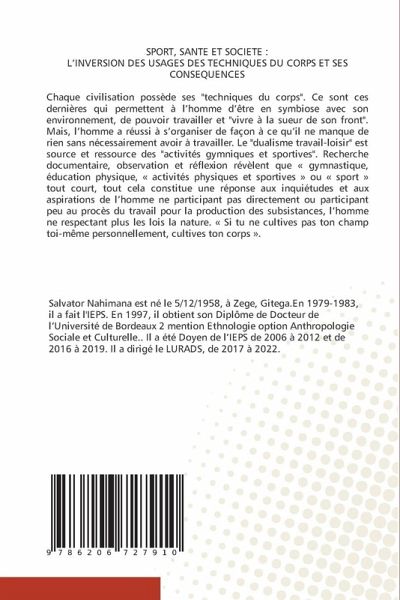 SPORT, SANTE ET SOCIETE : L'INVERSION DES USAGES DES TECHNIQUES DU CORPS ET SES CONSEQUENCESChaque civilisation possède ses "techniques du corps". Ce sont ces dernières qui permettent à l'homme d'être en symbiose avec son environnement, de pouvoir travailler et "vivre à la sueur de son front". Mais, l'homme a réussi à s'organiser de façon à ce qu'il ne manque de rien sans nécessairement avoir à travailler. Le "dualisme travail-loisir" est source et ressource des "activités gymniques et sportives". Recherche documentaire, observation et réflexion révèlent que « gymnastique, éducation physique, « activités physiques et sportives » ou « sport » tout court, tout cela constitue une réponse aux inquiétudes et aux aspirations de l'homme ne participant pas directement ou participant peu au procès du travail pour la production des subsistances, l'homme ne respectant plus les lois la nature. « Si tu ne cultives pas ton champ toi-même personnellement, cultives ton corps ».