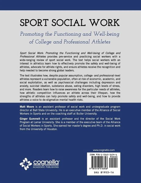 Sport Social Work: Promoting the Functioning and Well-being of College and Professional Athletes provides pre-service and practicing social workers with a wide-ranging review of sport social work. The text helps social workers with an interest in athletics learn how to effectively promote the safety and well-being of athletes, advocate for athlete rights, and ensure athletes receive the recognition and help needed to become strong global leaders. The text illustrates how, despite popular assumption, college- and professional-level athletes represent a vulnerable population, often at risk of economic, academic, and social exploitation, as well as psychosocial challenges including depression and anxiety, suicidal ideation, substance abuse, eating disorders, high levels of stress, and more. Readers learn how to raise awareness for the particular needs of athletes, how athletic competition influences an athlete across their lifespan, how the strengths of athletes can help promote safety and well-being, and how to provide athletes a voice to de-stigmatize mental health risks. Matt Moore is an assistant professor of social work and undergraduate program director at Ball State University. He is an executive member of the Alliance of Social Workers in Sports and on the coaching staff at Butler University. Ginger Gummelt is an assistant professor and the director of the Social Work Program at Lamar University. She is a member of the executive team of the Alliance of Social Workers in Sports. She earned her master’s degree and Ph.D. in social work from the University of Houston.
