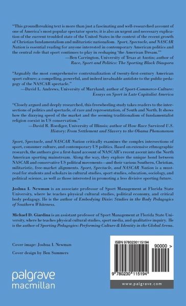 "This groundbreaking text is more than just a fascinating and well-researched account of one of America s most popular spectator sports; it is also an urgent and necessary explication of the current troubled state of the United States in the context of the recent growth of Christian fundamentalism and militaristic nationalism. Sport, Spectacle, and NASCAR Nation is essential reading for anyone interested in contemporary American politics and the central role that sport continues to play in reshaping the American Dream. " - Ben Carrington, University of Texas at Austin; author of Race, Sport and Politics: The Sporting Black Diaspora