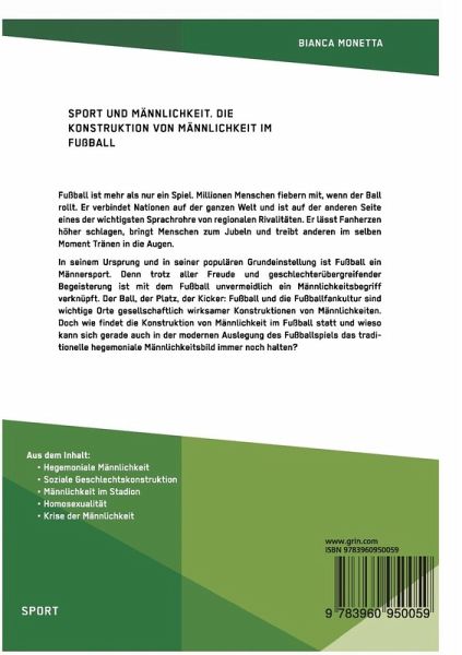 Fußball ist mehr als nur ein Spiel. Millionen Menschen fiebern mit, wenn der Ball rollt. Er verbindet Nationen auf der ganzen Welt und ist auf der anderen Seite eines der wichtigsten Sprachrohre von regionalen Rivalitäten. Er lässt Fanherzen höher schlagen, bringt Menschen zum Jubeln und treibt anderen im selben Moment Tränen in die Augen. In seinem Ursprung und in seiner populären Grundeinstellung ist Fußball ein Männersport. Denn trotz aller Freude und geschlechterübergreifender Begeisterung ist mit dem Fußball unvermeidlich ein Männlichkeitsbegriff verknüpft. Der Ball, der Platz, der Kicker: Fußball und die Fußballfankultur sind wichtige Orte gesellschaftlich wirksamer Konstruktionen von Männlichkeiten. Doch wie findet die Konstruktion von Männlichkeit im Fußball statt und wieso kann sich gerade auch in der modernen Auslegung des Fußballspiels das traditionelle hegemoniale Männlichkeitsbild immer noch halten? -Hegemoniale Männlichkeit;-Soziale Geschlechtskonstruktion;-Männlichkeit im Stadion;-Homosexualität;-Krise der Männlichkeit