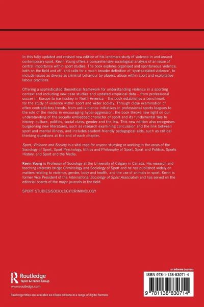 In this fully updated and revised new edition of his landmark study of violence in and around contemporary sport, Kevin Young offers a comprehensive sociological analysis of an issue of central importance within sport studies. The book explores organised and spontaneous violence, both on the field and off, and calls for a much broader definition of 'sports-related violence', to include issues as diverse as criminal behaviour by players, abuse within sport and exploitative labour practices. Offering a sophisticated theoretical framework for understanding violence in a sporting context and including new case studies and updated empirical data - from professional soccer in Europe to ice hockey in North America - the book establishes a benchmark for the study of violence within sport and wider society. Through close examination of often contradictory trends, from anti-violence initiatives in professional sports leagues to the role of the media in encouraging hyper-aggression, the book throws new light on our understanding of the socially-embedded character of sport and its fundamental ties to history, culture, politics, social class, gender and the law. This new edition also recognises burgeoning new literatures, such as research examining concussion and the link between sport and mental illness and includes student-friendly pedagogical aids, such as critical thinking questions at the end of each chapter. Sport, Violence and Society is a vital read for anyone studying or working in the areas of the Sociology of Sport, Sport Psychology, Ethics and Philosophy of Sport, Sport and Politics, Sports History, and Sport and the Media.