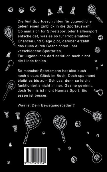 Die fünf Sportgeschichten für Jugendliche geben einen Einblick in die Sportauswahl. Ob man sich für Streetsport oder Hallensport entscheidet, was es so für Problematiken, Chancen und Siege gibt, darüber erzählt das Buch durch Geschichten über verschiedene Sportarten.Für Jugendliche darf natürlich auch nicht die Liebe fehlen.So mancher Sportsmann hat also auch noch dieses Glück im Buch. Doch spannend bleibt es bis zum Schluss, denn so leicht funktioniert es nicht immer. Gesine gewinnt, doch Tennis ist nicht Hannas Sport, Eis essen ist besser. Was ist Dein Bewegungsbedarf?